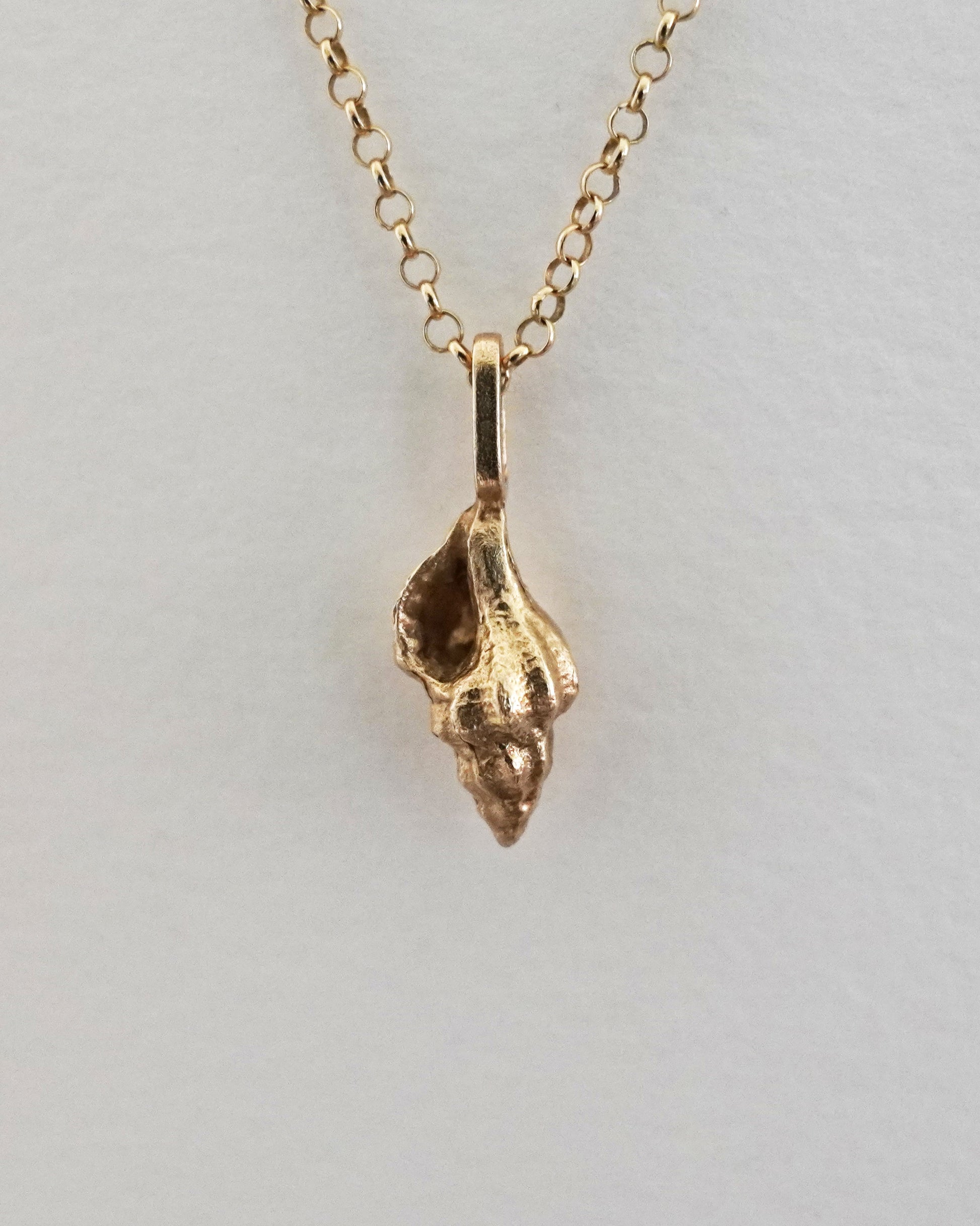 The Concha pendant captures the delicate curves and intricate ridges of a natural shell in solid gold, preserving every detail of the original texture and organic shape. Available in 9k or 18k gold this piece is suspended by and elongated bail on a classic belcher chain.